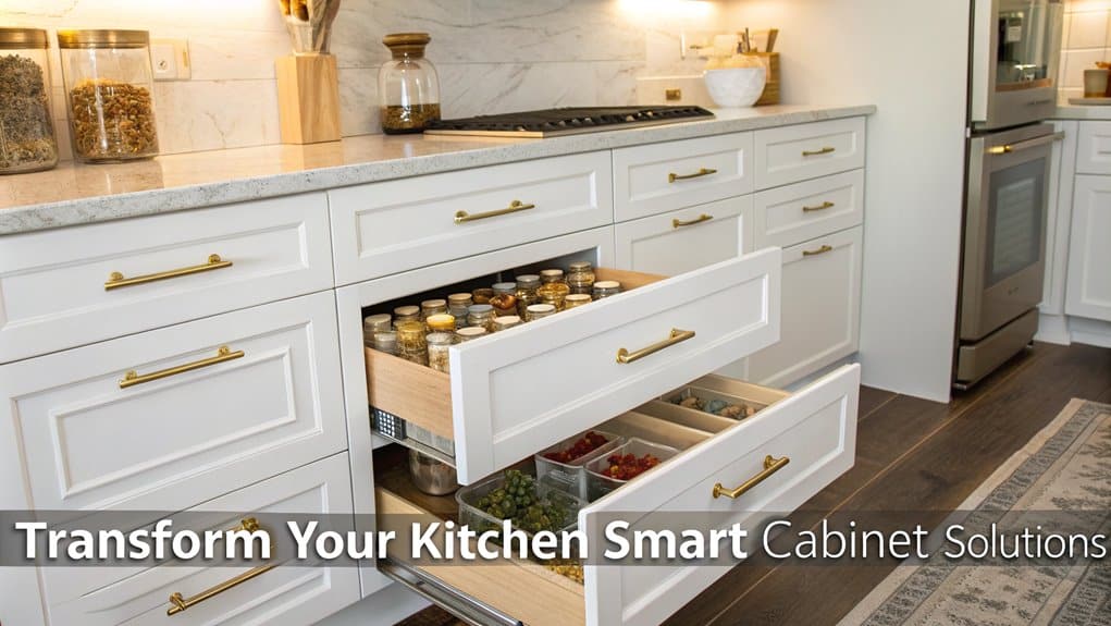 While glass cabinet doors can enhance visual appeal, smart storage solutions maximize your kitchen's functionality. Through vertical space maximization, you'll transform cluttered cabinets into efficient storage areas that work for your daily needs.