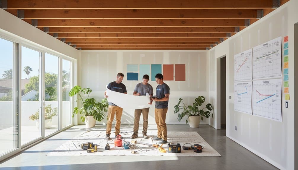 To effectively plan and design your home remodel, begin with comprehensive consultations to define your project's scope and vision. Collaborate with a skilled contractor to develop detailed blueprints, typically within two weeks, while discussing essential elements such as design ideas, materials, and budget constraints.